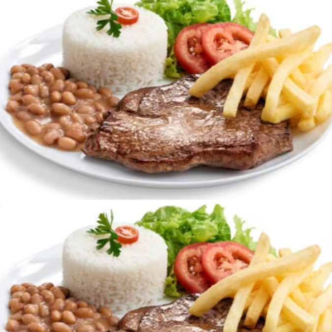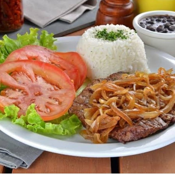 Além de completo, agora em dobro! Delicioso Bife de filé de alcatra acebolado com arroz e feijão de caldo e você poderá adicionar Fritas!