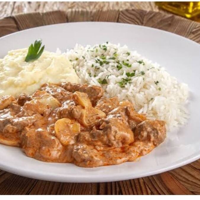 Este é especial! Delicioso Strogonoff Gourmet, acompanha arroz, Purê de batata e pra fechar com chave de ouro... Acompanha também batata palha!