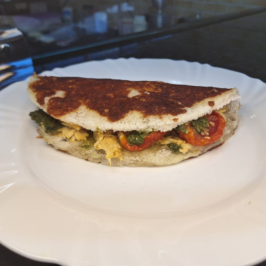 Tapioca de Frango, minas frescal, molho pesto e tomate seco