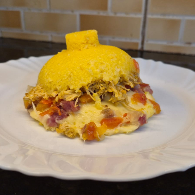 Cuscuz com Frango, queijo, bacon, cebola e tomate