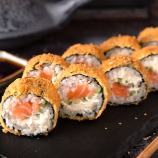 sushi enrolado com alga, arroz japonês, cream cheese, salmão e couve frito.
