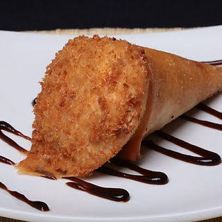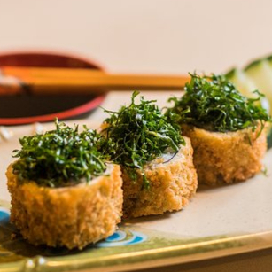 Deliciosos rolinhos de sushi fritos com recheio de salmão e kani