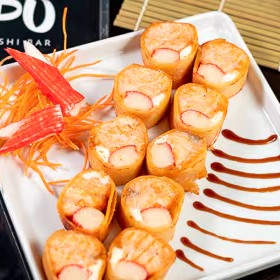 8 peças - salmão, kani e cream cheese. Envolvidos e fritos na massa de harumaki