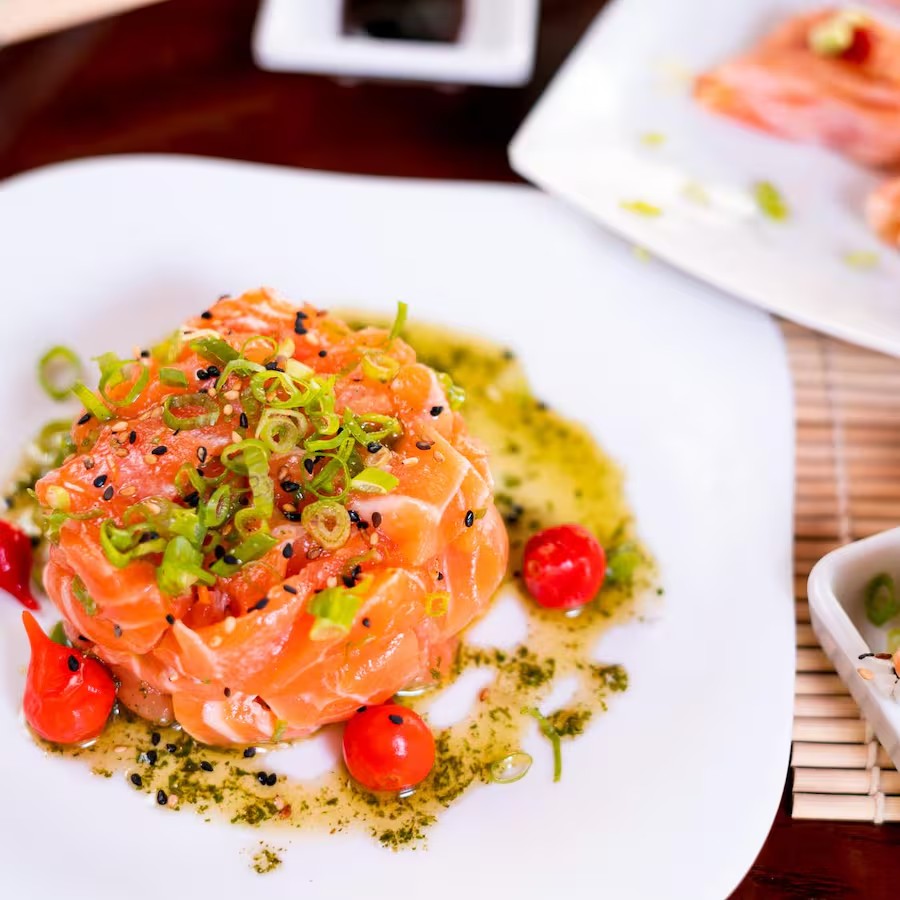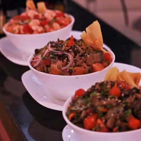 Salmão, atum, camarão, kani temperados com vinagre balsâmico, suco de limão, pimenta Sriracha, gengibre, cebola roxa e tomate cereja