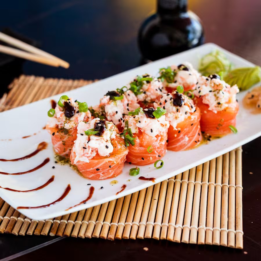 8 peças - dyo de salmão maçaricado, com recheio de camarão e cream cheese, coberto com molho tarê, cebolinha, gergelim