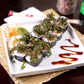 8 peças - Sushi enrolado na folha da acelga com recheio de salmão grelhado, cream cheese e Doritos