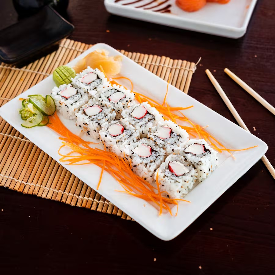 8 peças - enrolado de alga com kani, pepino e manga.
