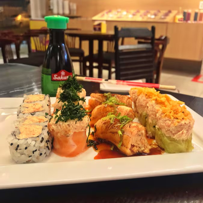 Sashimi maçaricado, ebi fire, toppu maki, ebitem especial e niguiri maçaricado com cream cheese e gergelim.