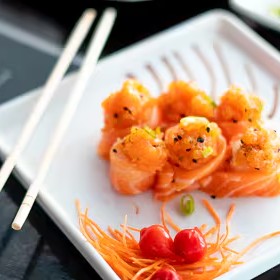 Lâmina de salmão maçaricado com recheio de salmão cru, camarão, cream cheese, geléia de rubras, teriaki e molho de ervas.