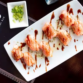 Lâmina de salmão maçaricado com recheio de salmão cru, cream cheese, geléia de rubras, teriaki e molho de ervas.