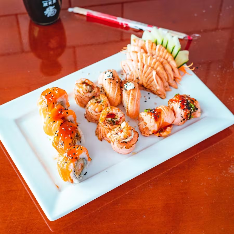 4 filadelfia, 4 uramaki de salmão, 2 niguiri, 2 ebitem de kani e 2 dyo de salmão.