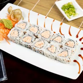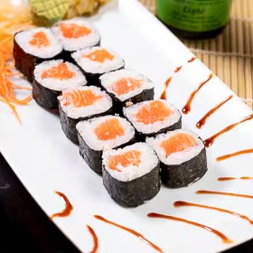 8 peças - enrolado de alga com arroz, salmão grelhado e cream cheese.