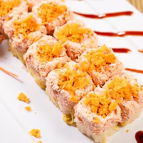8 peças - uramaki especial de camarão empanado com cream cheese, coberto com lâmina de salmão maçaricado e toque de geléia de rubras, cebolinha e gergelim