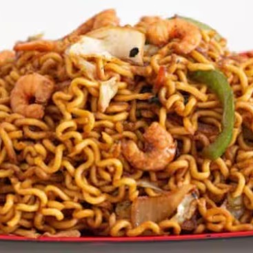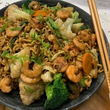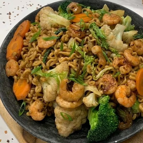 Delicioso yakisoba preparado com macarrão oriental, camarões suculentos e frescos, criando uma combinação perfeita de sabores orientais.