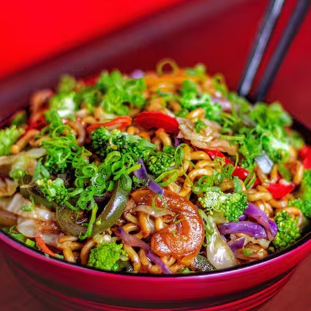 Macarrão oriental salteado no wok com legumes frescos e selecionados, como brócolis e cenoura, oferecendo uma opção saudável e saborosa.