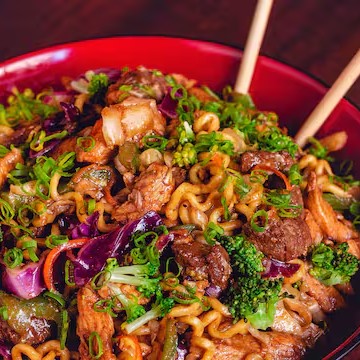 Macarrão oriental salteado no wok com uma combinação irresistível de carne e frango, perfeito para quem busca variedade.