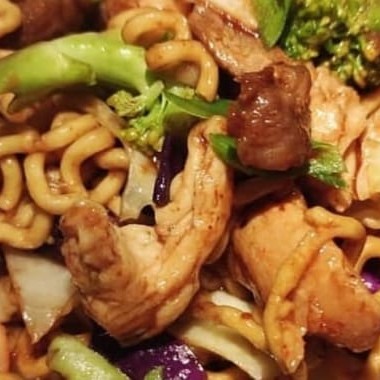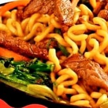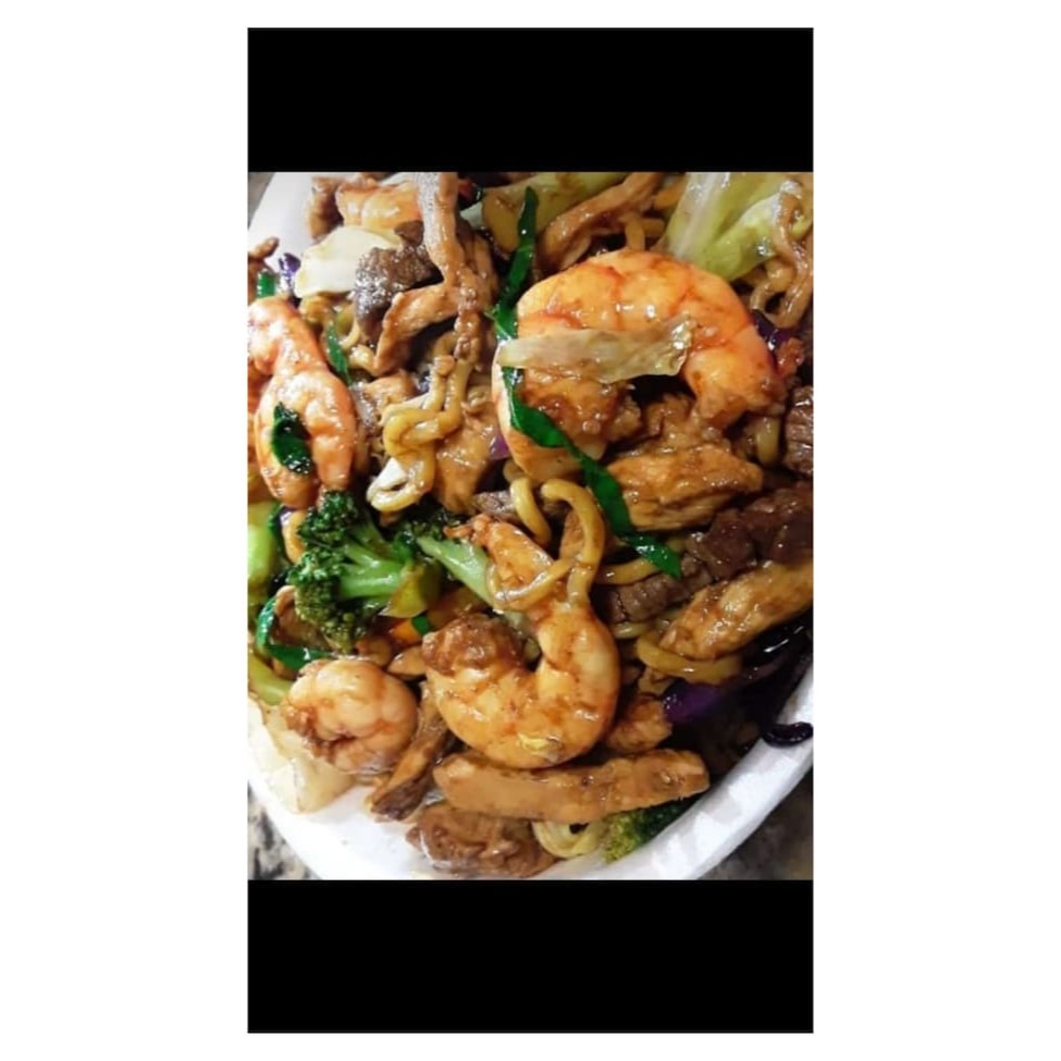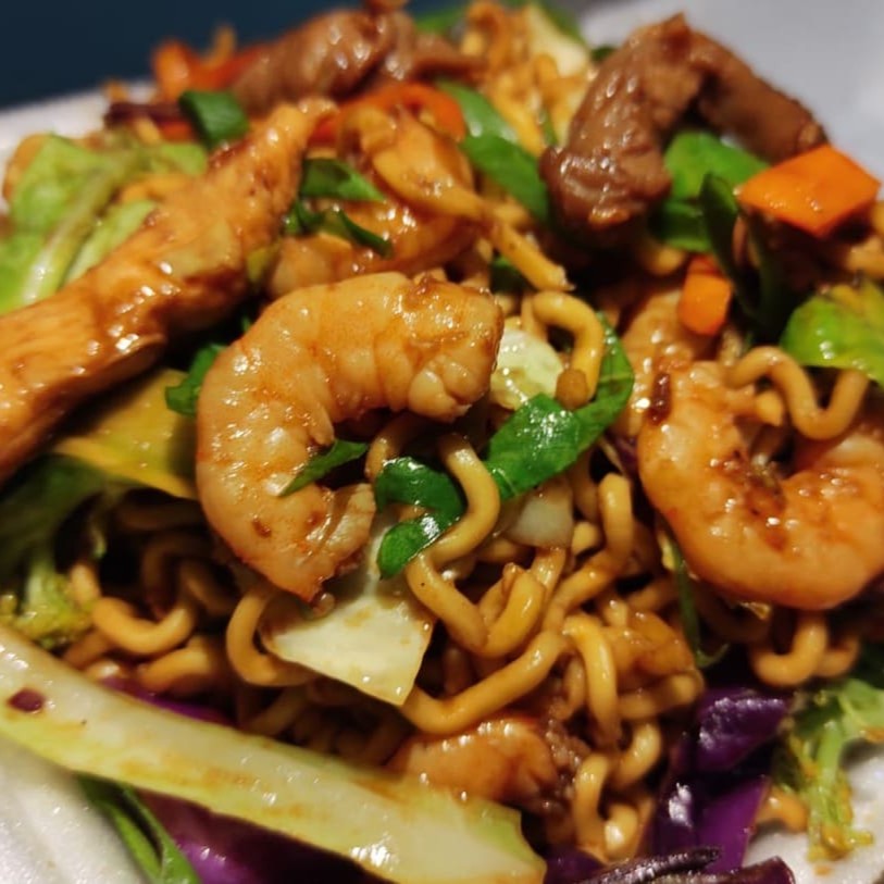 Carne, frango, camarão, legumes, macarrão e molhos especiais
