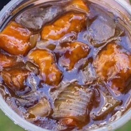Peito de frango cortado em cubos com cebola, pimentões e cenoura refolgados em molho oriental.