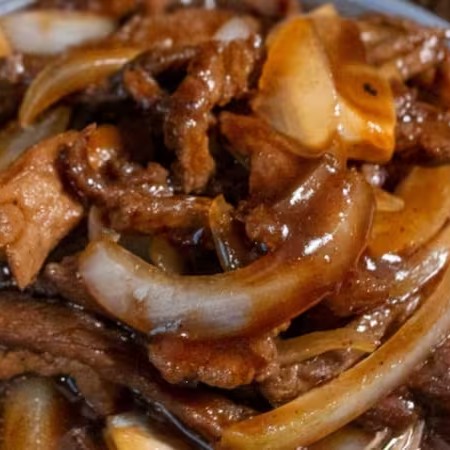 Tiras de carne bovina com cebola refolgadas em molho oriental!