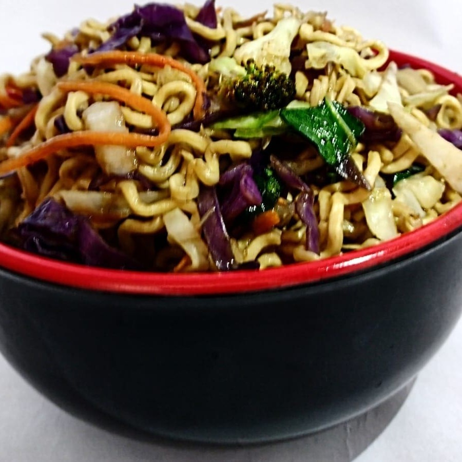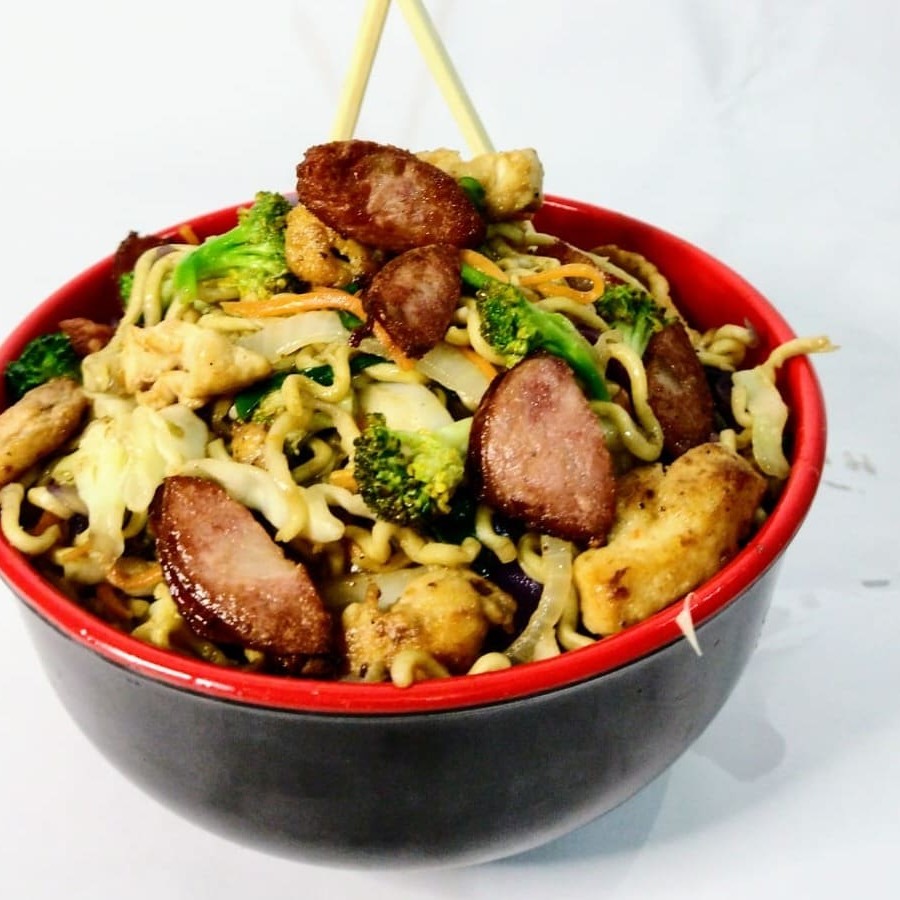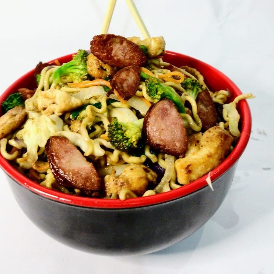 Yakisoba de frango com calabresa repolho branco, repolho roxo, cenoura, brócolis, couve flor, acelga, cebola e couve