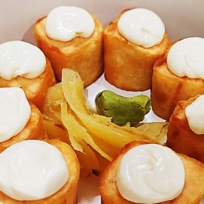 Hot roll preparado na massa folheada de harumaki, enrolado com salmão e cream cheese.