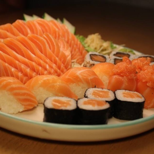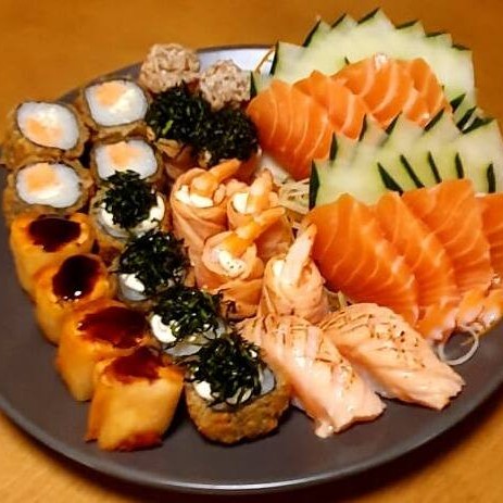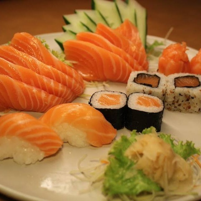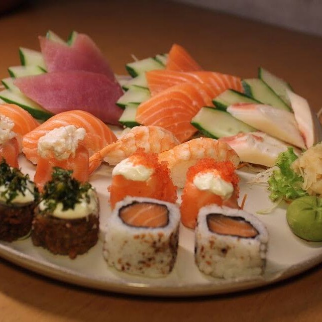 10 sashimis de atum, salmão e peixe branco, 6 sushis de salmão, peixe branco, polvo,camarão e ovos, 4 enrolados califórnia e 2 shakemaki