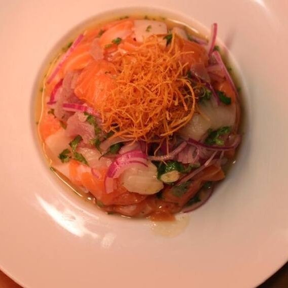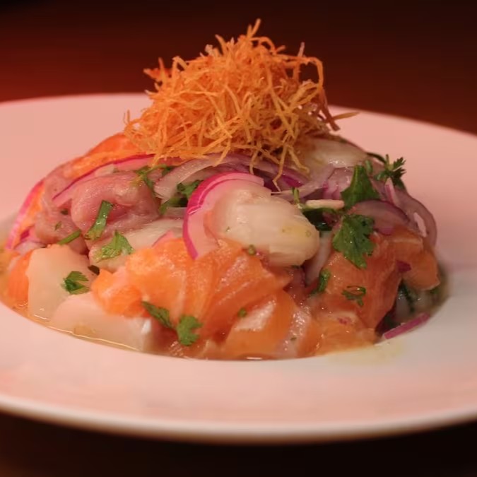 Elaborado com salmão, atum e peixe branco cortados em cubo, marinado no suco de laranja e limão.