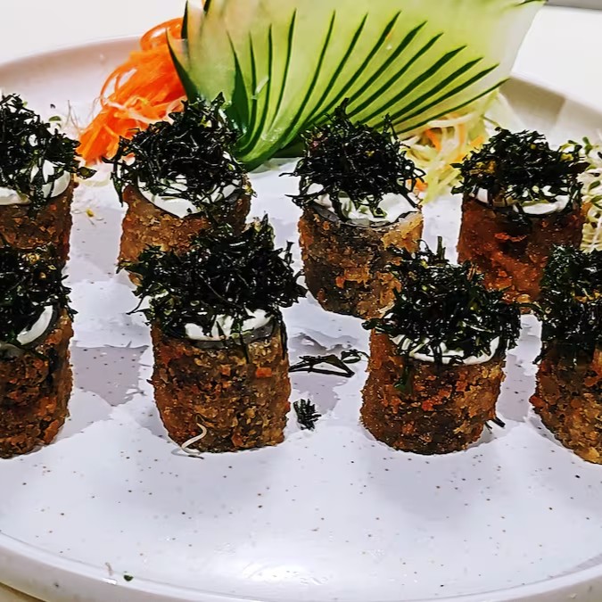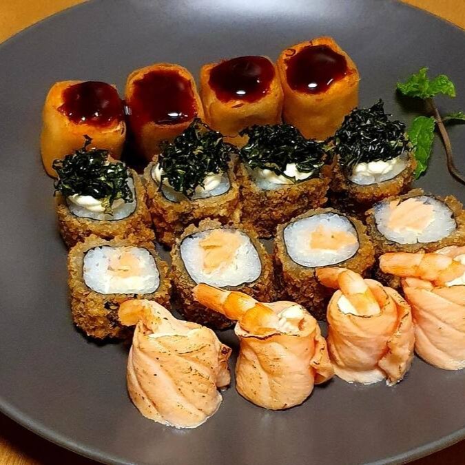 Sushi empanado com salmão, arroz, cream cheese e couve.