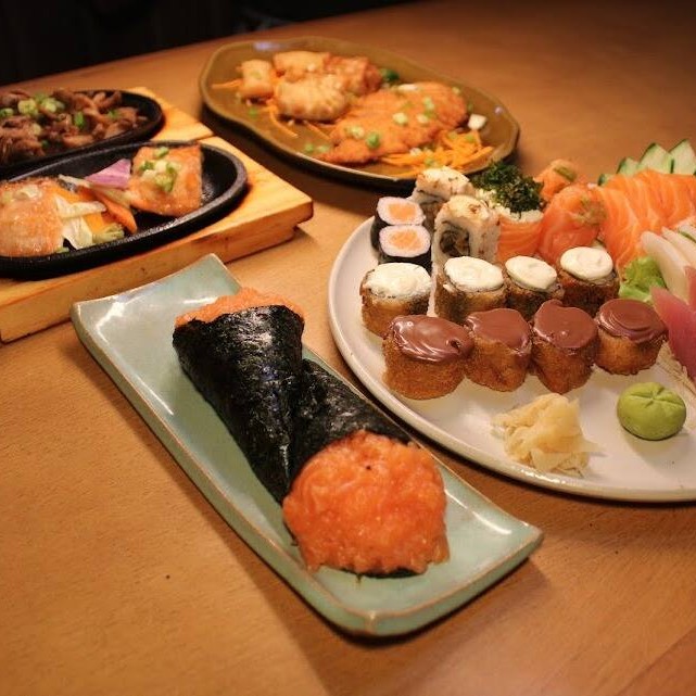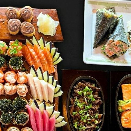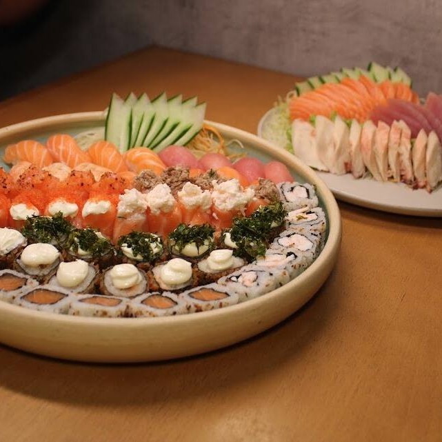 20 sashimis de atum, salmão e peixe branco, 12 sushis de salmão, peixe branco, polvo, camarão e ovos, 8 enrolados califórnia e 4 shakemaki