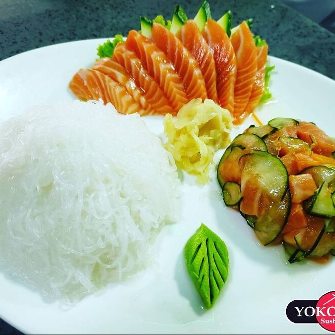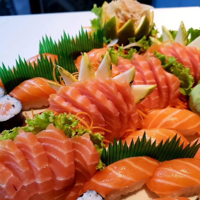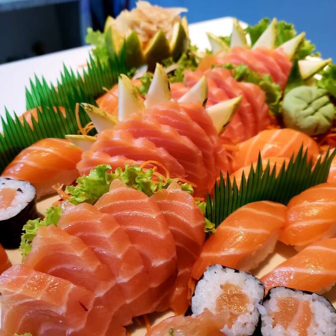 12 Sashimis Salmao ; Atum e peixe branco 2 jou de salmão, 2 uramki de salmão,2 uramaki skin, 2 niguiri e salmão,2 niguiri skin, 4 hot roll especial, 4 hot de banana com chocolate.