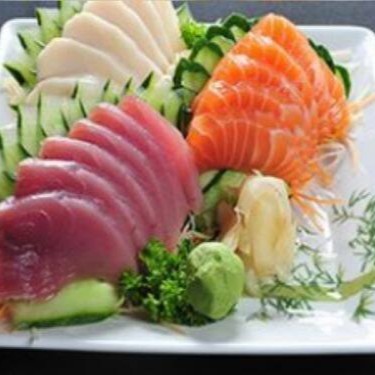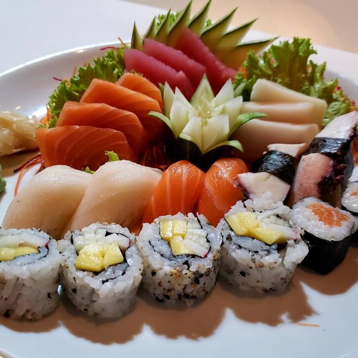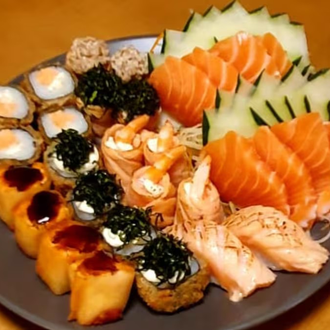 10 sashimis de atum, salmão e peixe branco 6 sushis de salmão, peixe polvo, camarão e ovos, 4 enrolados califórnia e 2 shakemaki