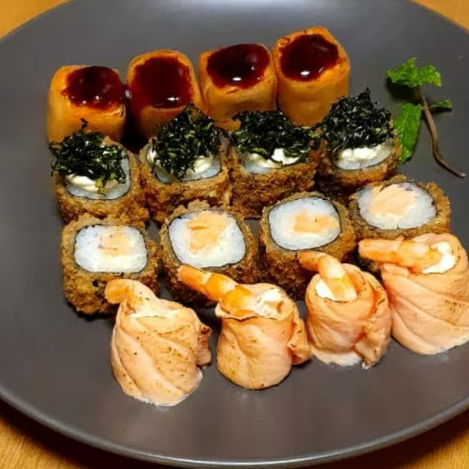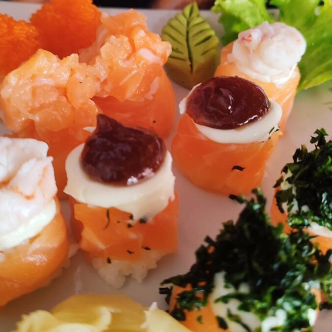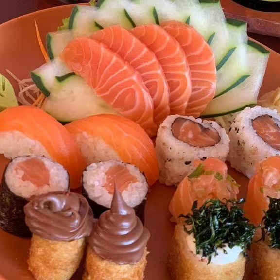 12 Sashimis Salmao , Atum e peixe branco 3 jou massaricado de camarão,2 jou de salmão, 2 jou couve, 4 hot roll especial, 4 hot com couve,4 hot de banana com chocolate.