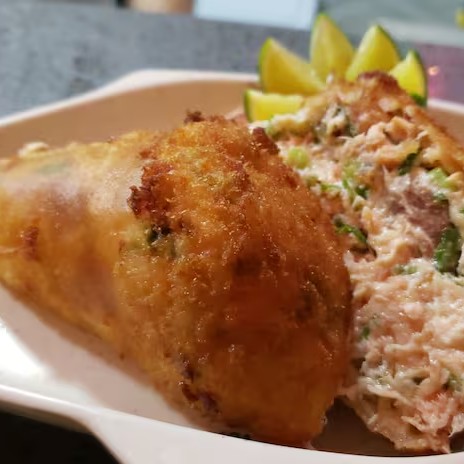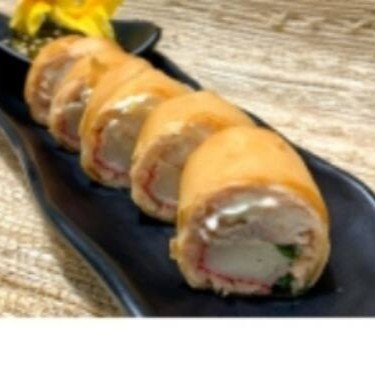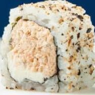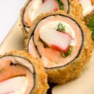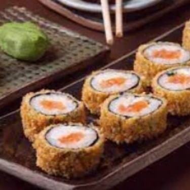 Temaki hot empanado e frito arroz com recheio de salmão.