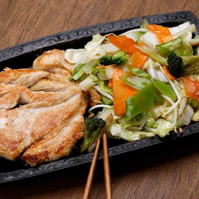 1 shimeji, 2 rolinho de queijo, 2 guioza, 2 pedaços de salmão,1 chicken katsu.