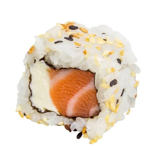 Enrolados em forma de cone, alga por fora. Com creme chesse e cebolinha