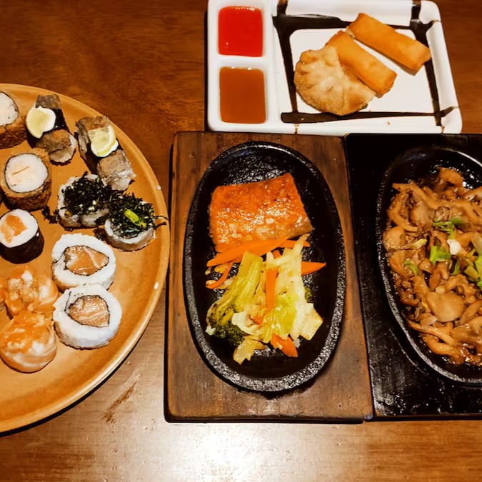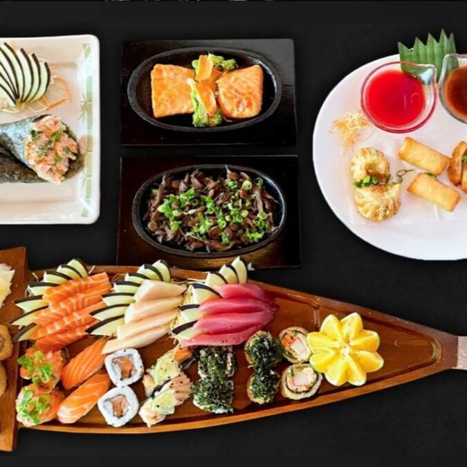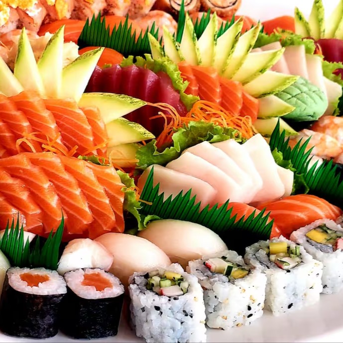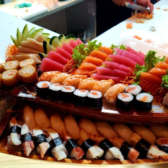 40 sashimis de atum, salmão e peixe branco, 30 sushis de salmão, peixe branco, polvo, camarão e ovos, 24 enrolados califórnia, shakemaki , baterá e hot hol