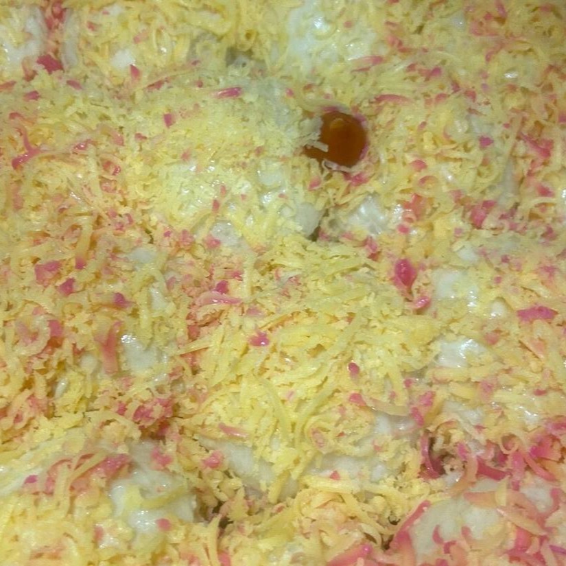 Cuscuz ( p )de carne do sol desfiada queijo mussarela e manteiga por cima +salada vinagrete.