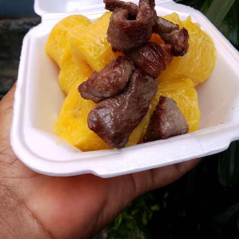 300 Gr de banana da terra cozida +150 gr de carne do sol frita acebolada.