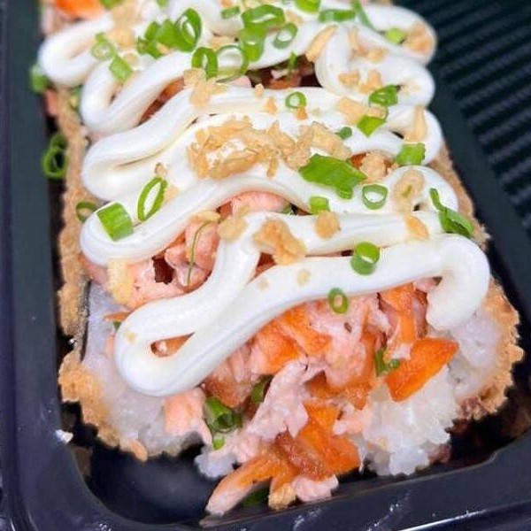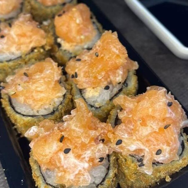 Hot Philadelphia com cobertura de patê de salmão fresco, com cream cheese e cebolinha.
