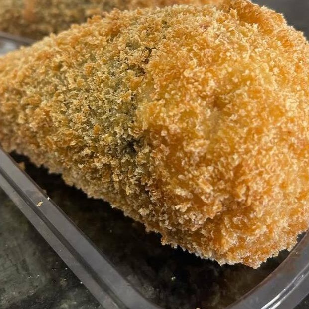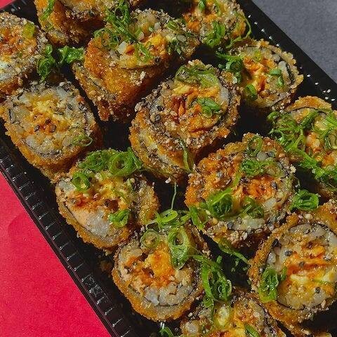 Temaki recheado com salmão grelhado, arroz japa, cream cheese e cebolinha, empanado na farinha panko.