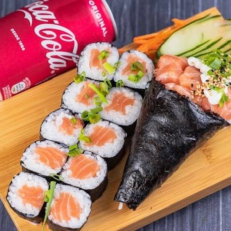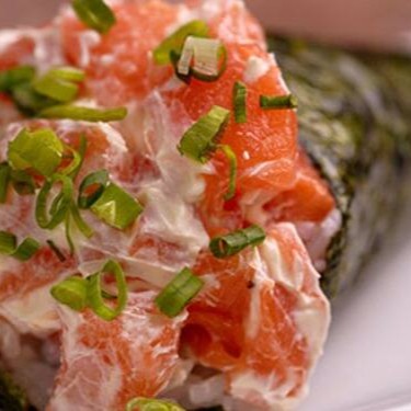 Delicioso temaki de salmão fresco com cream cheese, cebolinha e arroz japa.