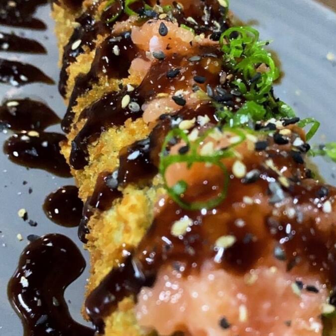 Delicioso big hot recheado com salmão fresco, cream cheese, cebolinha, gergelim, molho teriyaki e arroz japa.