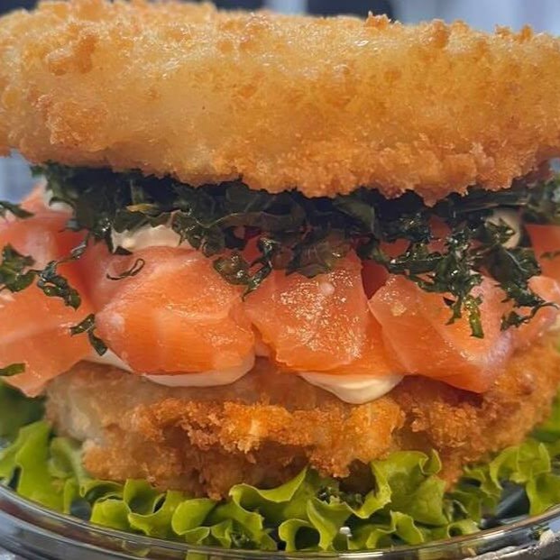Sushi burguer com a massa feita de arroz japa, com cream cheese, farinha panko, recheado com salmão fresco, cream cheese, couve crispy e cebolinha.