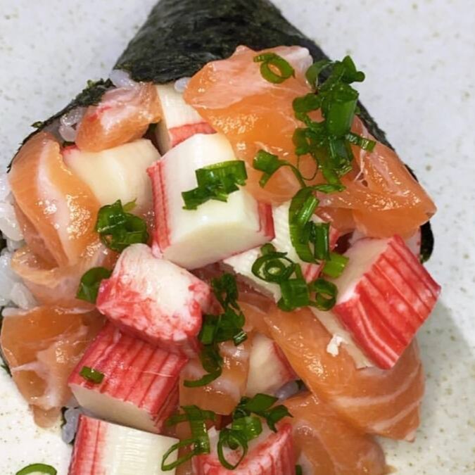 Temeki recheado com kani e salmão fresco com arroz japa, cream cheese e cebolinha.