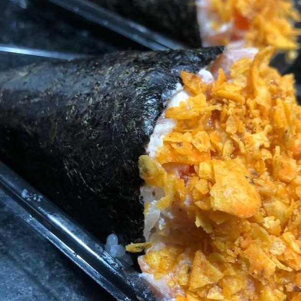 Temaki de salmão fresco, com cream cheese e cebolinha, coberto com Doritos.