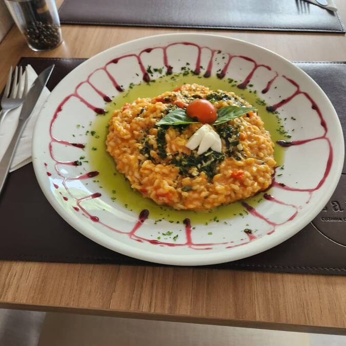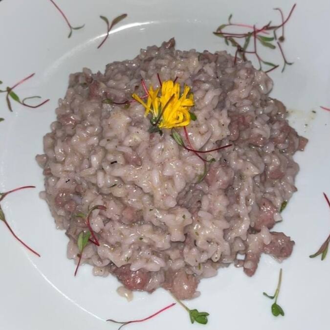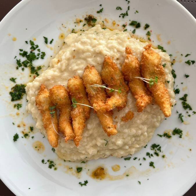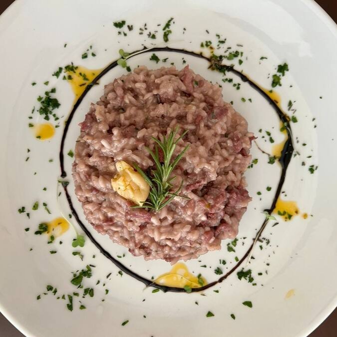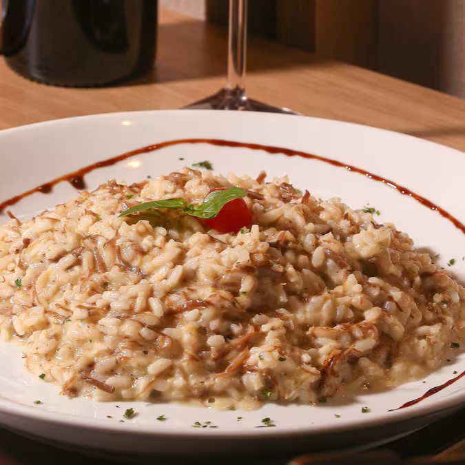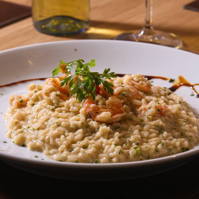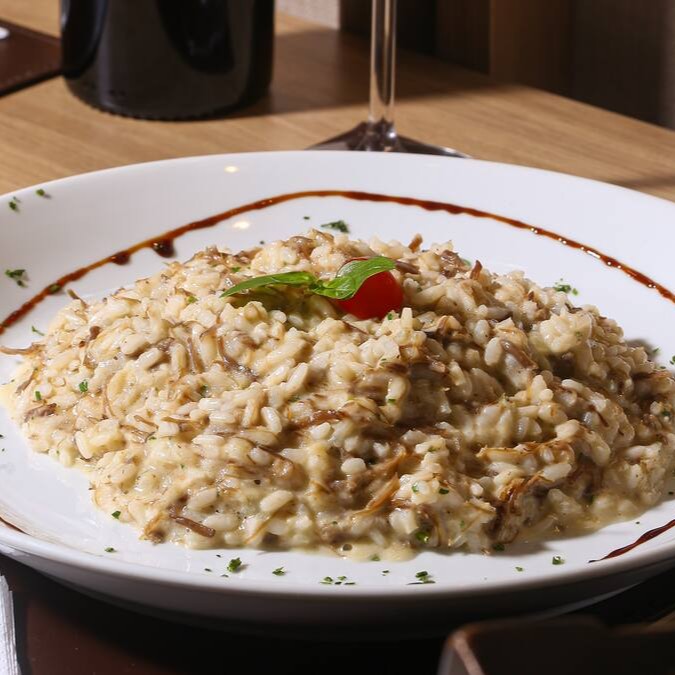 Arroz arbório cremoso, linguiça toscana, manteiga, brie, azeite aromatizado.