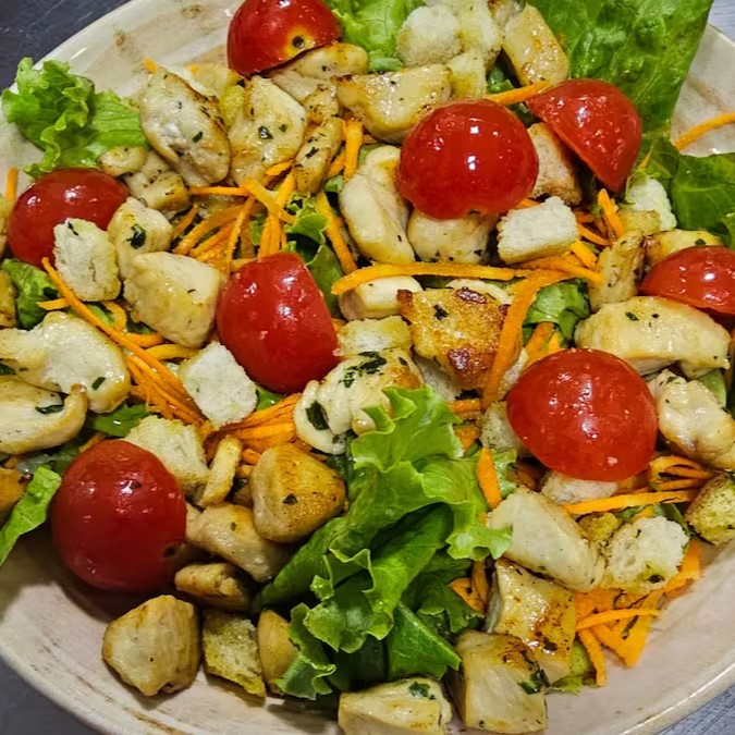 Mix de folhas, cenoura, 150g de frango grelhado, tomates e cruttons