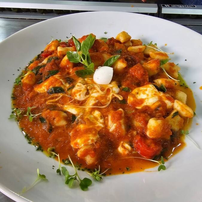 Nhoque com molho de tomate artesanal, manjericão e muçarela de búfala
