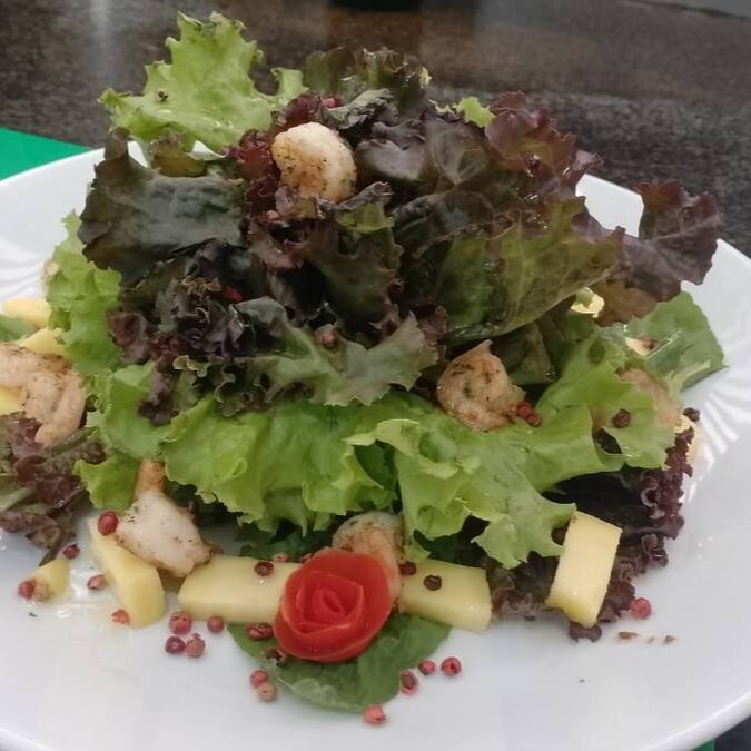 Mix de folhas, cenoura baby, pimenta rosa, 8 camarões grelhados