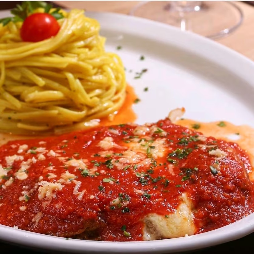 Filé de frango empanado com parmesão e ovos, muçarela, molho de tomate artesanal. Acompanha massa na manteiga